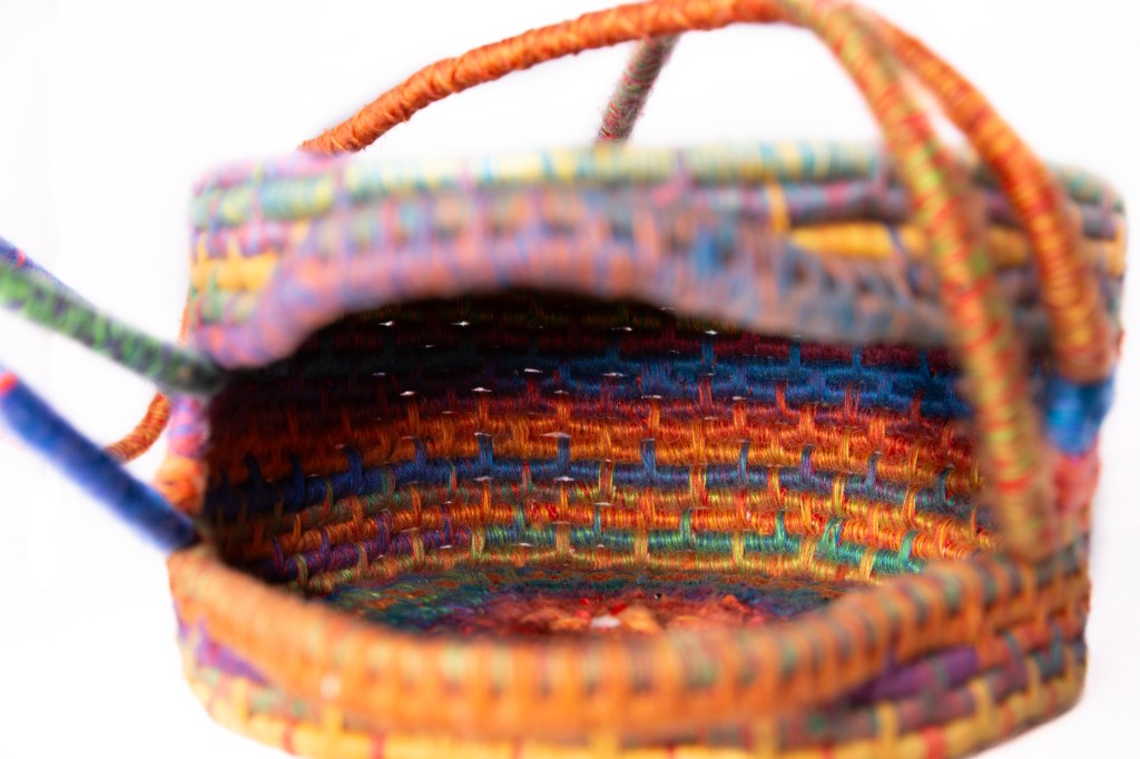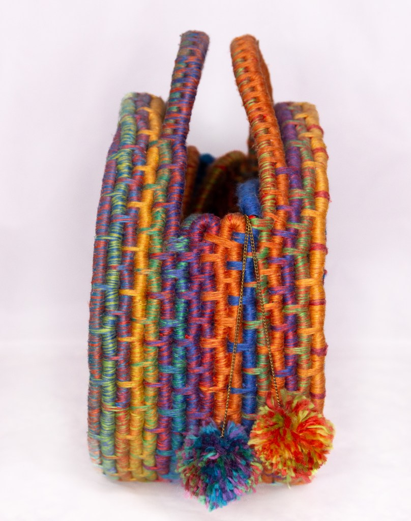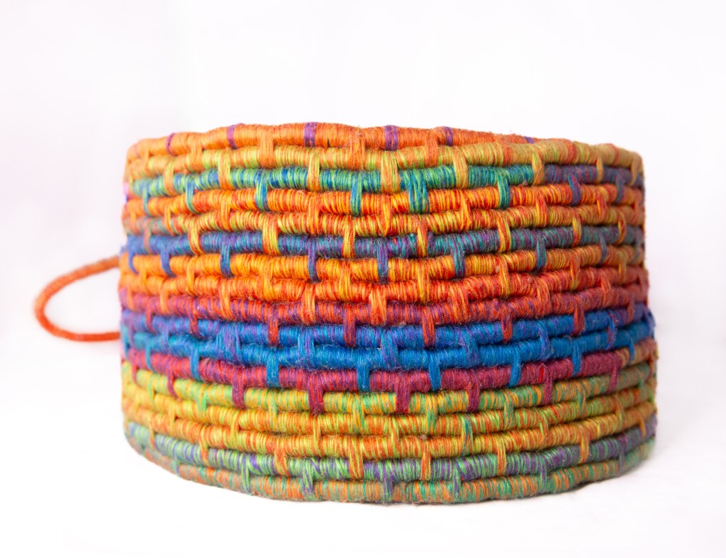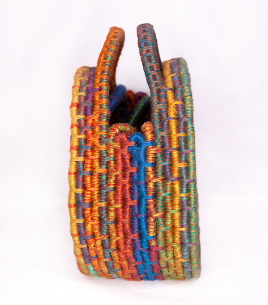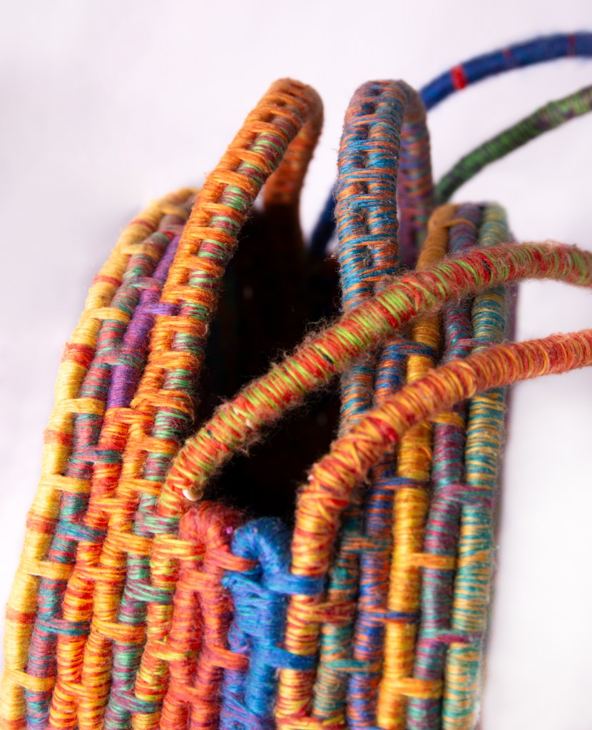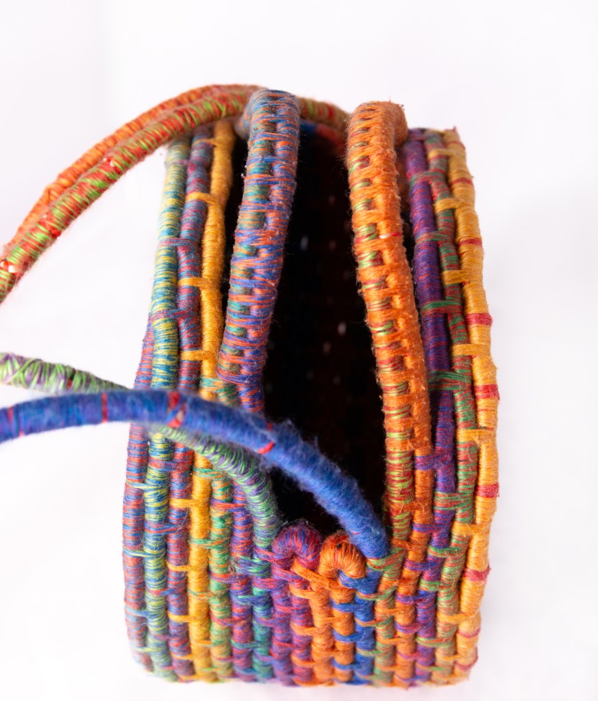 I learned a lot while making this! The yarn was super fuzzy, which didn’t make it look very polished. The rope was too bulky for a bag so it’s a bit heavy and awkward on the hip. But the handles make up for that! It reminds me of a hat box and I love it! The straps also had a lot of gaps. It wasn’t that bad when I was wrapping but as the bag got used, the yarn shifted and exposed more rope. It’s also very hard weaving inward so one side is more tightly wrapped than the other!